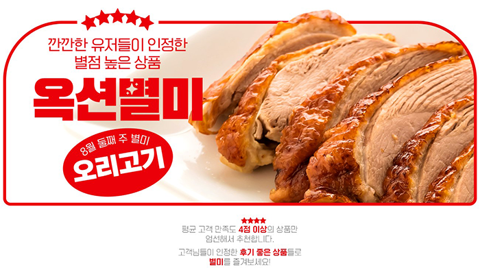 다양한 추천상품도 만날 수 있다. ‘지금 주목할 식품’ 코너를 통해 ‘오리훈제 통 마리’, ‘흑후추 훈제오리 6팩’, ‘김나운 오리주물럭 5팩’, ‘정다운 허브훈제오리 6팩’ 등을 특가에 공개한다. 이 밖에도 MD가 추천하는 ‘고객후기 1,000개 돌파 상품’, 옥션별미 판매실적 베스트 상품을 모아 놓은